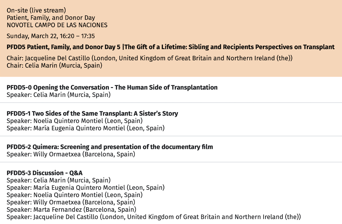 En esta sesión contaremos con dos testimonios muy especiales de Noelia, paciente con leucemia mieloide aguda trasplantada de médula ósea y de Geny, su hermana y donante del trasplante. Juntas compartirán su experiencia personal, ofreciendo a profesionales sanitarios, pacientes, cuidadores y asistentes una visión única sobre la relación entre pacientes y donantes y el impacto humano del trasplante de médula ósea.