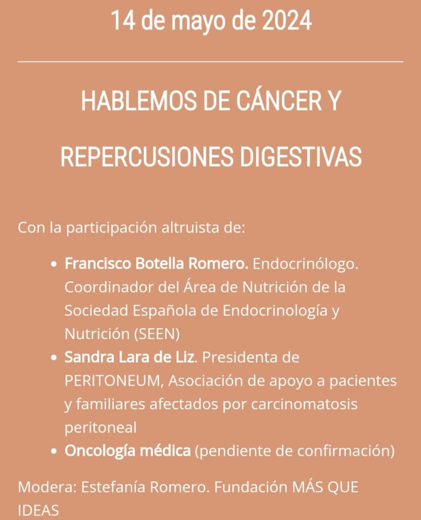Las repercusiones digestivas en muchas ocasiones acompañan a las personas con cáncer durante la enfermedad y sus tratamientos. Contaremos con el endocrino Francisco Botella y Sandra Lara, presidenta de PERITONEUM, asociación de apoyo a pacientes y familiares afectados por carcinomatosis peritoneal. Dialogaremos sobre efectos secundarios como la mucositis, las náuseas, los vómitos y la diarrea y nuestros ponentes nos darán pautas para sobrellevarlos mejor.